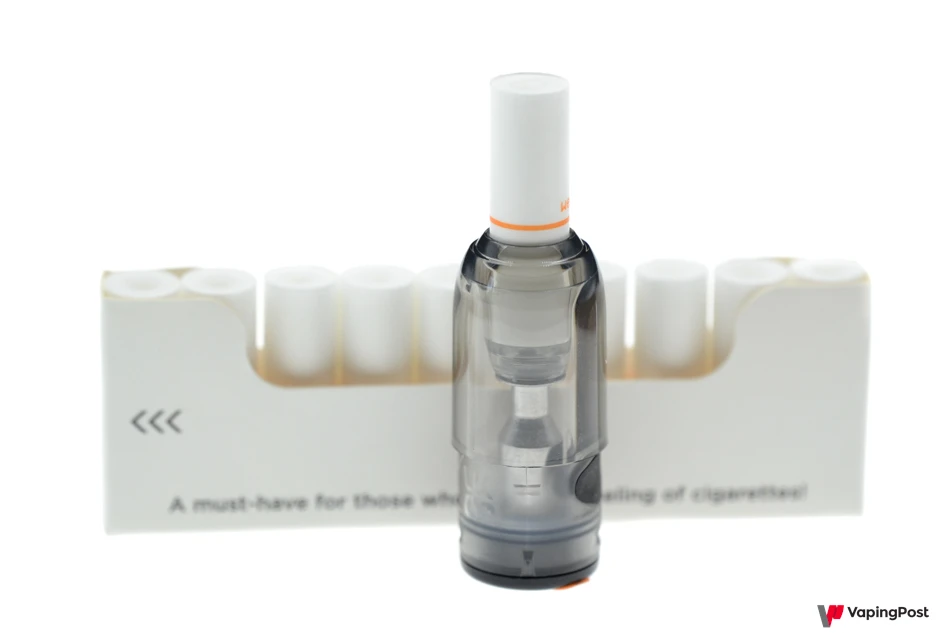 Filters are also included in the box. There are 10 of them, replacing the mouthpiece of the 0.8 ohm cartridge only, to mimic the feel of a cigarette filter on the lips. The number of filters is quite generous for a beginner’s kit.