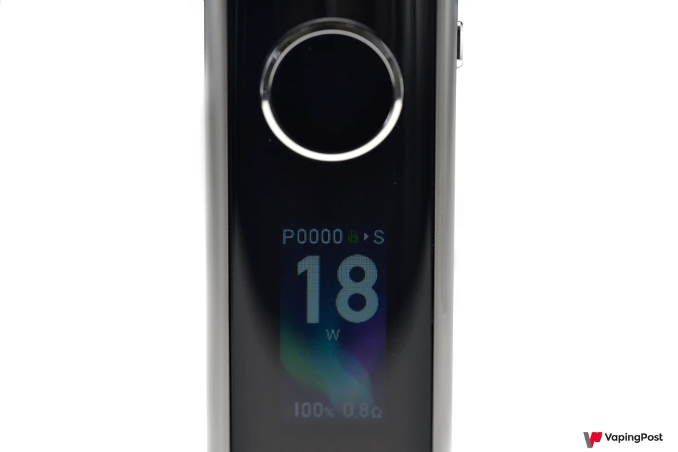 Just below the button, a screen displays essential information to the user. Power adjustment is touch-sensitive. In the menu, you can set the activation mode, power mode (Smart, which automatically adjusts the power based on the resistance, or manual), reset the puff counter, and activate an Eco mode that minimizes screen animations and vibrations to save battery. The screen is bright and remains legible even in strong sunlight.