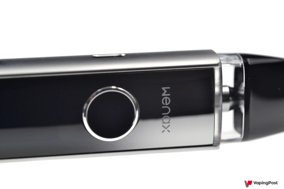 On the front face, there’s a barely protruding firing button that lights up when in use. You can choose the vapor production method: either by inhalation, by pressing the button, or by combining both modes. At the top of the pod, the cartridge is securely held with no looseness. It lights up from underneath during operation, a handy feature in low-light conditions.