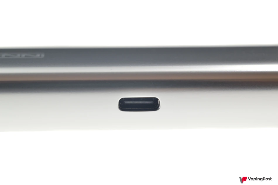 A slider on the side opposite the USB-C connector makes it easy to adjust the airflow that cools the coil. Fully open, you can vape in a very restricted direct-to-lung mode. Conversely, by blocking the airflow inlets, the draw becomes much tighter for mouth-to-lung inhalation.