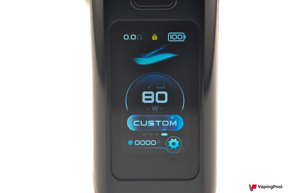 On the front, the screen occupies a prominent position. It is color, touch-sensitive, and displays essential information like selected power, coil resistance, puff count, and remaining battery life. Several modes are available, such as Eco mode, which adjusts power to the lowest level within a coil’s range. Custom mode allows users to set their preferred wattage, while Smart mode automatically matches the power to the coil resistance. A Boost mode maximizes power output based on the coil’s resistance.