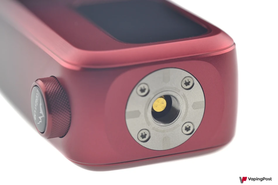 The top of the Vinci Spark 220 box features a platform that can accommodate an atomizer with a maximum diameter of 24.5 mm. The kit is designed for use with the included Uforce-X Tank. The spring-mounted connector ensures consistent contact between the mod and the tank.