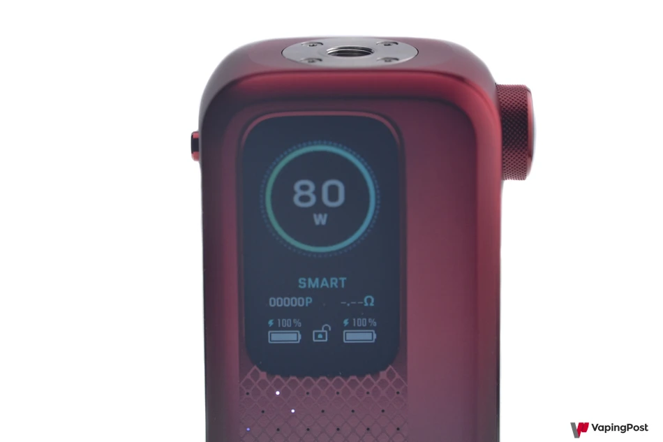 The color screen displays all essential information for the user, including selected power, vape mode, coil resistance, and battery percentage.