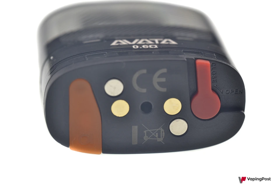 The filling port is located under the orange silicone tab at the bottom of the cartridge. It’s large enough to fit most e-liquid bottle tips. A small red piece manages the opening and closing of the passage between the two reservoir sections.