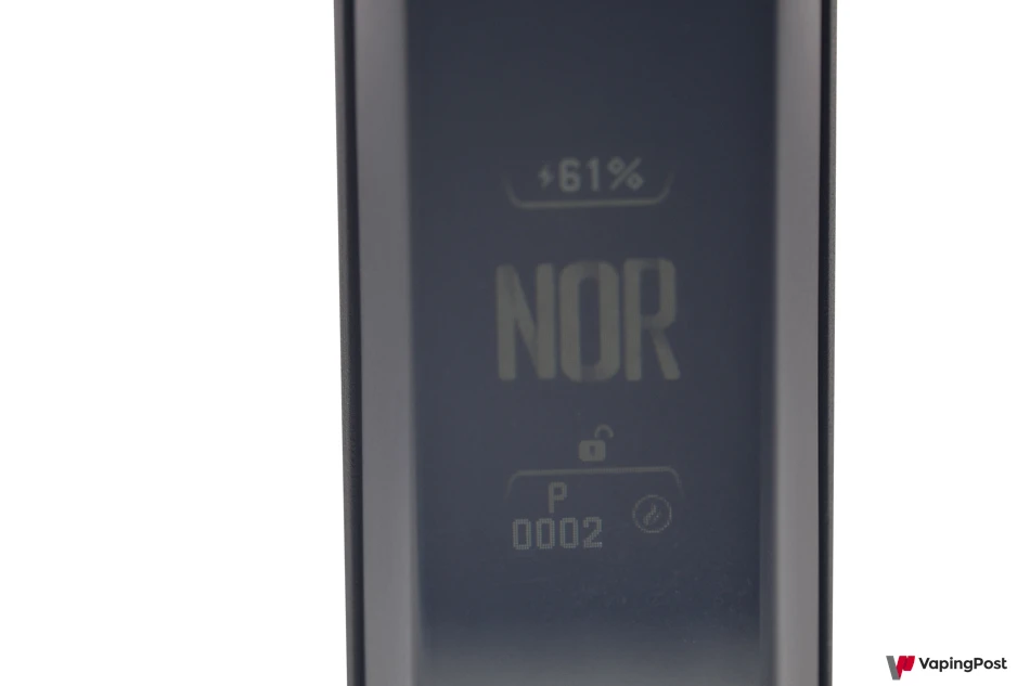 The screen is built into the front panel of the pod, displaying all essential information: selected mode, battery level, puff count, and more.