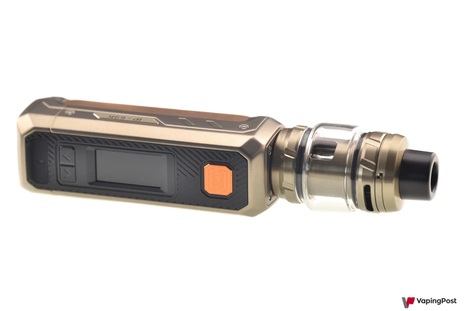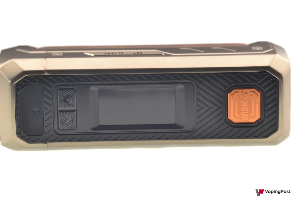 On the front, there’s a sufficiently large screen for easy reading, a wide fire button that naturally falls under the finger, and two adjustment buttons for navigating the menus and tuning the settings. A USB-C port protected by a thick silicone cover completes the setup. This is where the box is charged. The Armour Ultra is extremely robust and offers IP68, IP69K and MIL-STD-810H certifications for drop protection. Chances are the tank will break long before the box if it falls.