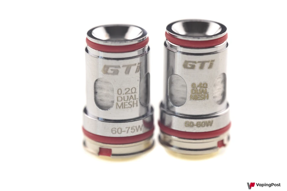 Two GTI coils are included in the kit. The first is a 0.2-ohm coil for use between 60 and 75 W. The second is 0.4 ohm, ideal between 50 and 60 W.