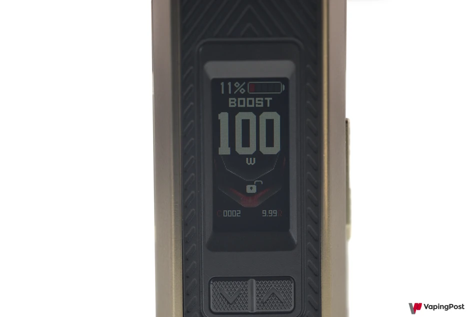 The display is bright enough for instant reading. The Armour Ultra delivers up to 100 W, though 75 W is plenty for the most demanding coil.