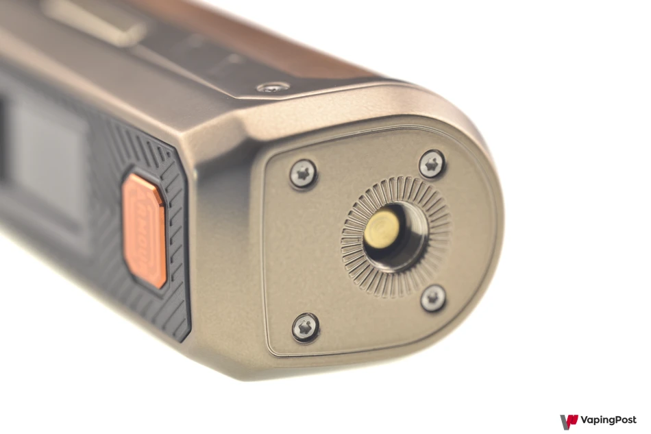 The top of the Armour Ultra mod supports clearomisers/atomisers up to 24 mm in diameter. The spring-loaded 510 connection ensures perfect contact with the tank. A slight circular raised edge prevents the top of the box from being scratched when tightening an atomiser.