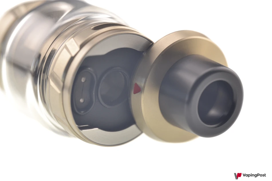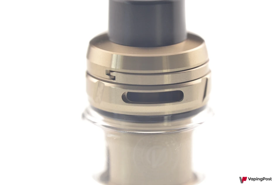 Two opposite windows let air flow through to cool the coil. Airflow volume is adjusted by rotating the ring that opens or restricts the passage. The wider the airflow, the airier and cooler the vape.