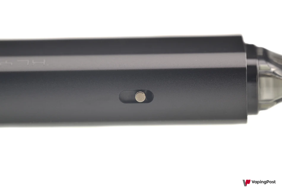 On the other side, a USB-C connection allows fast charging of the built-in 1800 mAh battery. It’s not the largest battery in this category of pods, but the supplied cartridge is very reasonable in terms of power consumption. It is possible to vape while charging the device. A small LED shows the battery level during both charging and use, changing color depending on the level.