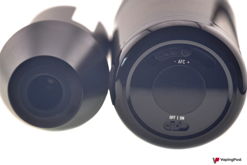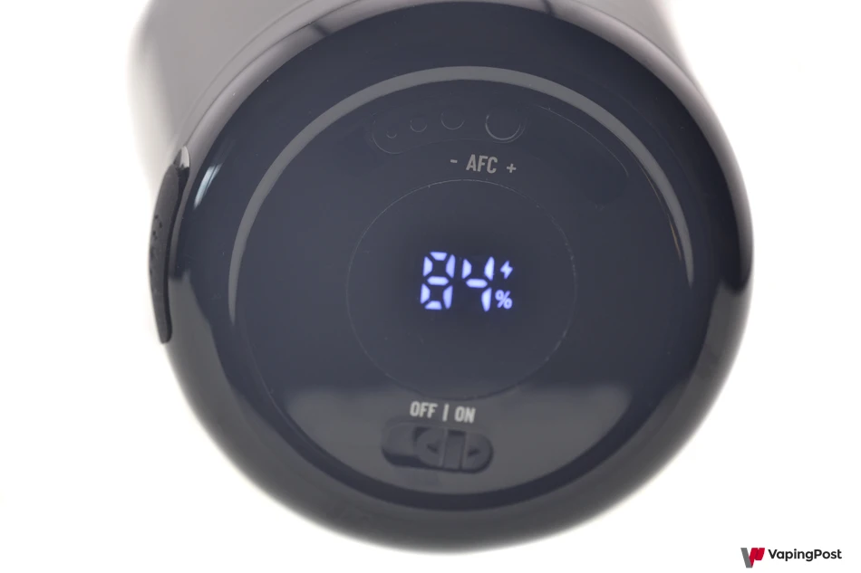 On top of the LC Lite, on the right side of the image, there is a display that shows the battery level, an On/Off button to power the device on or off, and a slider that adjusts the airflow entering the coil.