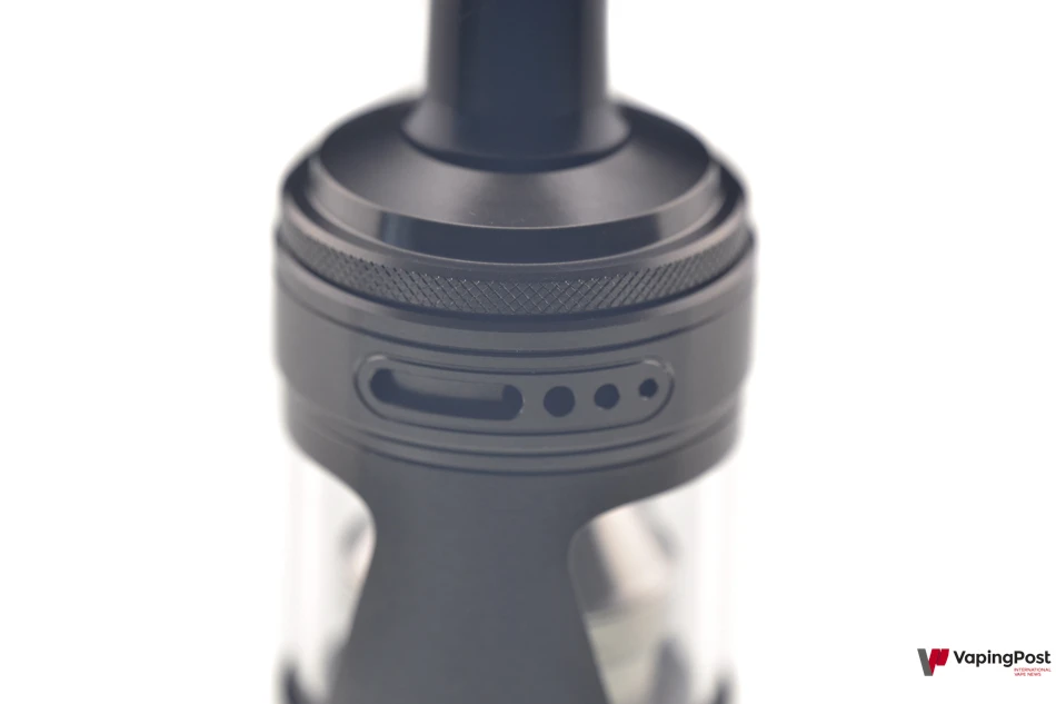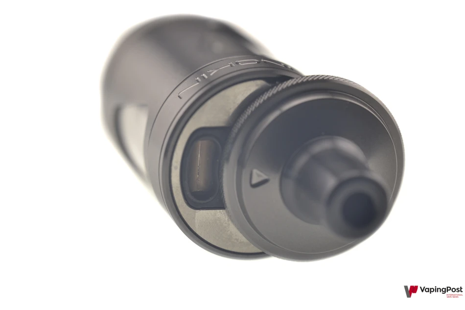 The sliding top cap provides access to the fill port, which is protected by a split silicone seal. The opening area is indicated by an arrow-shaped engraving. The resistance of the sliding mechanism is excellent, making it unlikely that the clearomizer will open on its own during transport.
