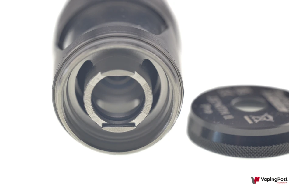 The Zenith 2 Pro features a top airflow design. The air inlets are located at the top of the clearomizer. This choice avoids the leaking issues more commonly encountered when airflows are positioned at the bottom. The air inlets are adjustable, ranging from a small circular opening to a wide slot. When the smallest opening is selected, the draw is very tight and the vapour warm to hot. Conversely, with the widest opening, the inhale is direct. This airflow configuration makes the Zenith 2 Pro versatile, offering two vaping styles in a single device.